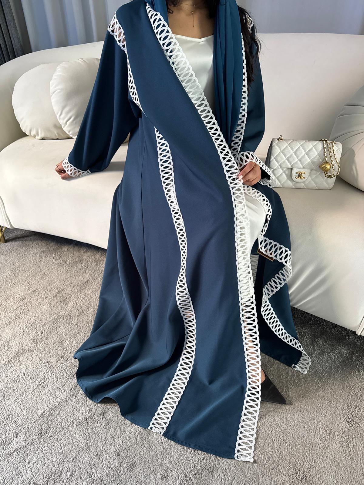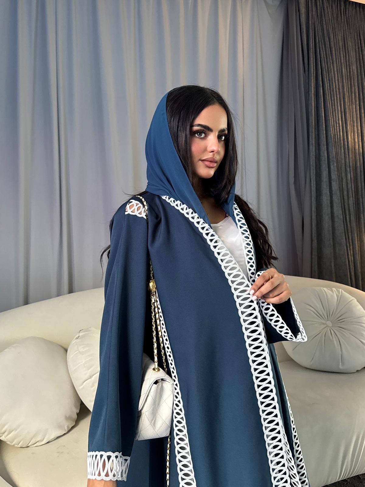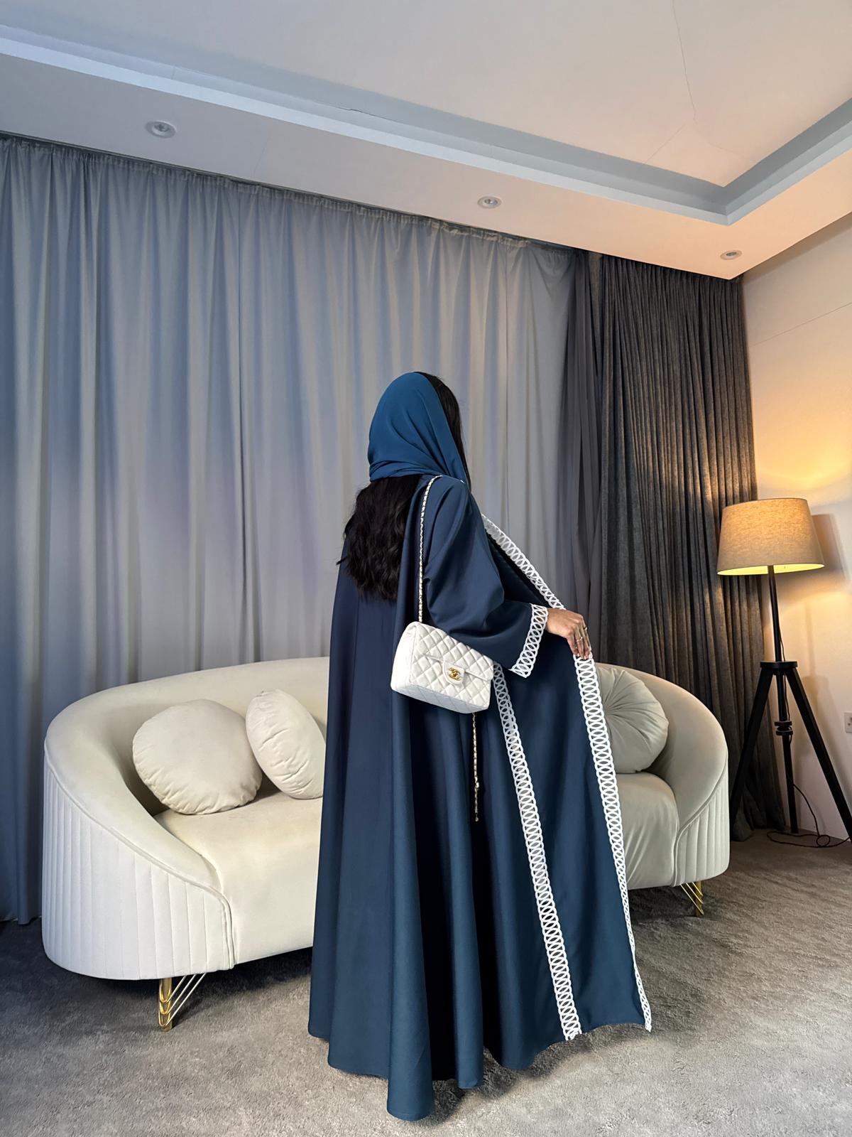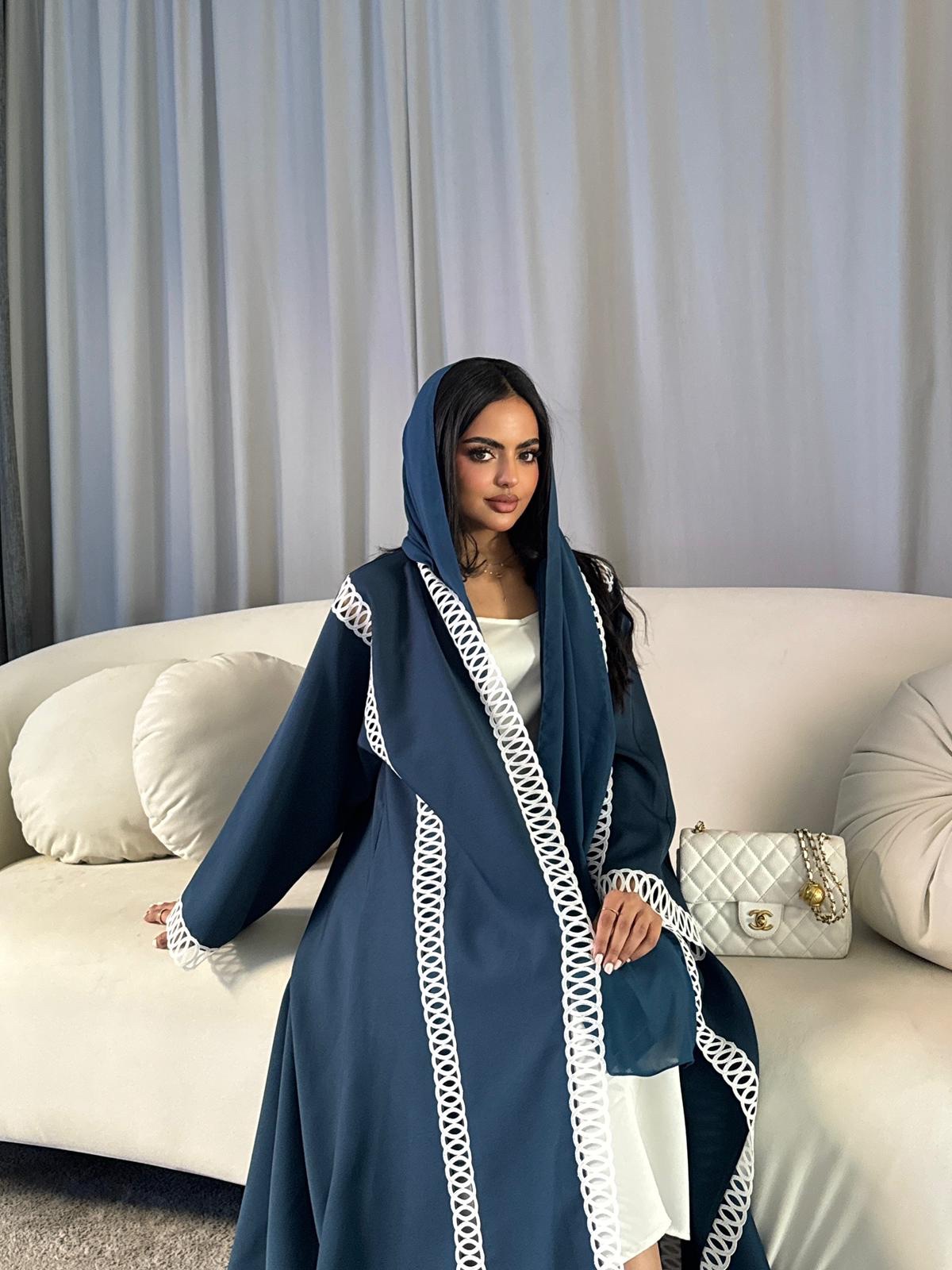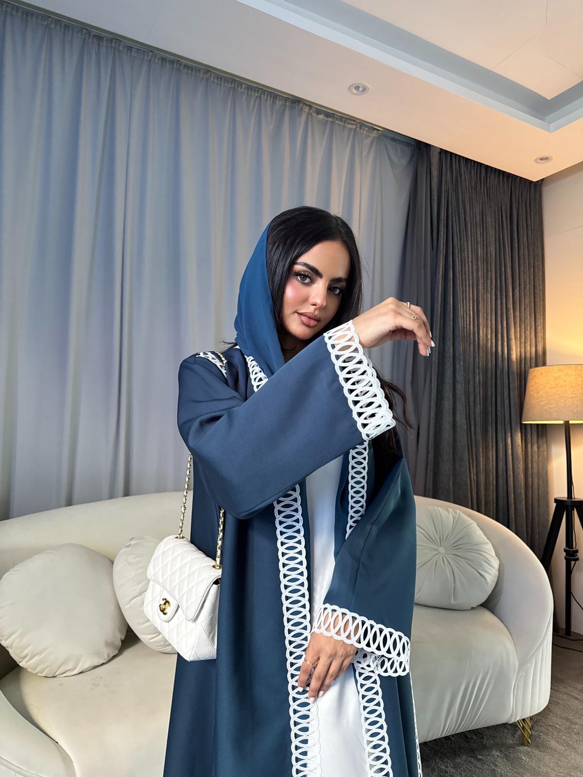 تصميم باللون التركوازي المميز و دخلنا معاه الزيج المطرز باللون الابيض ، قماش العباية كريب 🤍