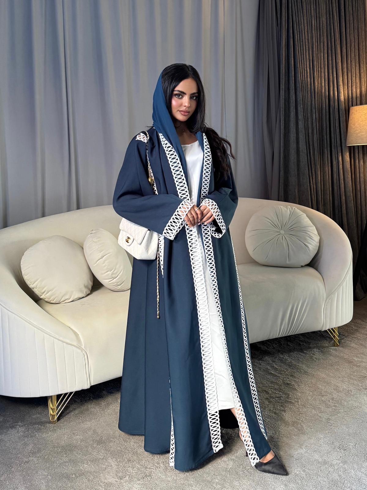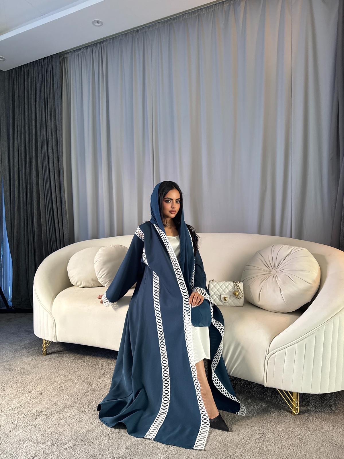 A black abaya decorated with white embroidery with an elegant embroidered sheila for elegant look.
